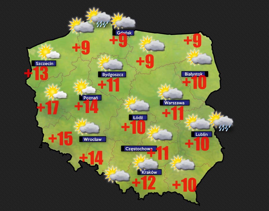 Zanim to nastąpi w nocy mroźnie będzie od Podlasia po północ Lubelskiego, Mazowsze, Łódzkie, południe WIelkopolski oraz w wielu regionach Dolnego Śląska. Najcieplej powinno być między Szczecinem a Gorzowem oraz w rejonie Katowic i Chrzanowa. W ciągu dnia powieje umiarkowany wiatr z północy na wschodzie i w centrum kraju oraz słaby nad resztą kraju.