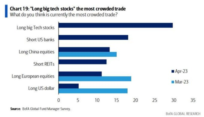 Ankieta przeprowadzona przez Bank of America pokazuje, iż większość inwestorów pozycjonuje się na dużych akcjach technologicznych. Widzą te firmy jako 'bezpieczna przystań’. Bezpieczną – gdy gospodarka będzie przez cały czas się dobrze trzymać. Jaki jest bias? Pozycjonowanie 'longów’ na dolarze wg. ankiety gwałtownie spada – sygnalizując agresywną grę na 'pivot Fed’. Oznacza to, iż jeżeli gospodarka jednak nie będzie silna – z akcji technologicznych prawdopodobnie odpłynie fala inwestorów. Haczyk jest jeden – ankieta pyta: „Co myślisz jest w tej chwili najpopularniejszym inwestycyjnym trendem?”. Zatem bardziej niż pozycjonowanie, ankieta pokazuje co ankietowani (zarządzający funduszami) myślą. Niekoniecznie więc sami posiadają ekspozycję na big-techy. Czy czarna prognoza Bank of America naprawdę się ziści?