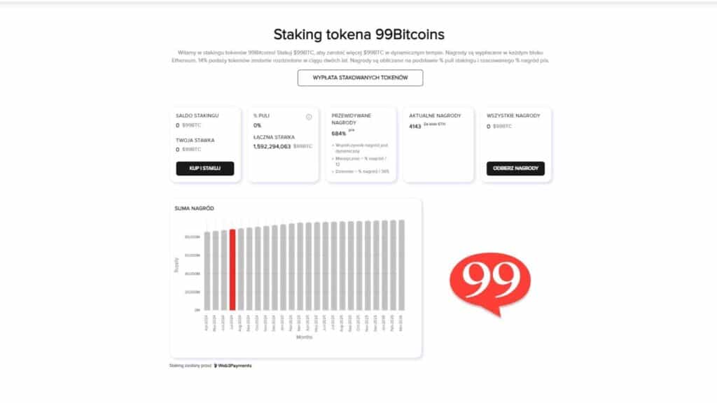 Staking kryptowalut polega na zablokowaniu ich na określony czas, podczas którego nie można ich sprzedać ani przenieść. W zamian uczestnicy otrzymują nagrody w postaci dodatkowych tokenów $99BTC.