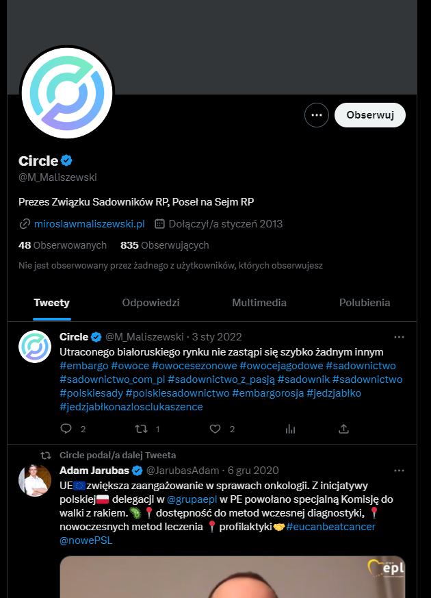Przejmowanie kont na Twitterze to bardzo popularny wektor ataków kryptowalutowych cyberprzestępców. Tworzy ono bowiem pewną aurę zaufania która umożliwia oszustom wykorzystanie psychologicznych słabości swoich ofiar. Pamiętajmy iż zawsze należy sprawdzić tzw. „Twitter handle”, czyli nazwę profilu zaczynającą się po symbolu @, a także kliknąć w niego w razie wątpliwości, po czym sprawdzić liczbę obserwujących i pozostałe informacje (poseł Maliszewski ma kilkuset obserwujących, profil Circle 140 tys.).