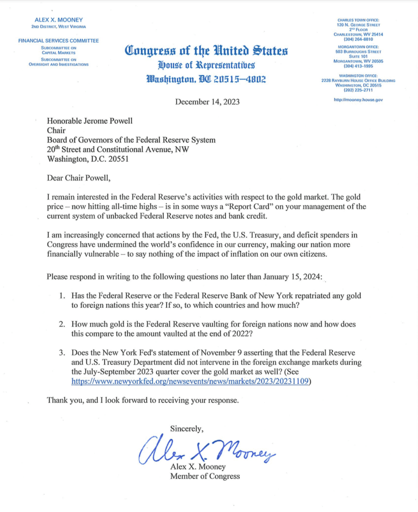 Kongresmen Alex Mooney skierował do prezesa FED interpelację w kwestii zasobów złota, które znajdują się w skarbcach Rezerwy. Powodem była sytuacja sprzed paru lat, a dotycząca niemieckiego złota. Do dziś nie doczekała się ona przy tym wyjaśnień. Zwłaszcza takich, które rozwiałyby obawy o to, iż złota w Dyspozycji FED może być daleko mniej, niż się to oficjalnie przyznaje.