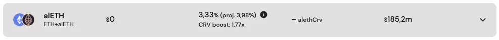 Jednym z protokołów pomagających w utrzymaniu pegga przez alETH jest Curve. Dostarczając płynności dla pary ETH/alETH na platformie Convex jesteśmy w stanie otrzymać 3,33% APR.