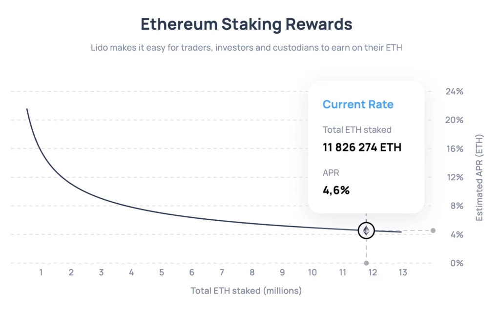 (źródło: link)Lido w zamian za zdeponowane ETH wydaje nam swój token stETH w proporcji 1:1. Token stETH może np. zostać użyty w innych protokołach DeFi jako zabezpieczenie. Dodatkowo, dzięki posiadaniu na swoim portfelu tokenów stETH możemy w łatwy sposób śledzić wzrost naszego portfolio, gdyż ich ilość powiększa się wraz z powiększaniem się naszego salda ETH.