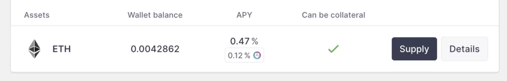 Tak np. AAVE oferuje jedynie 0.47% APY za depozyt ETH.