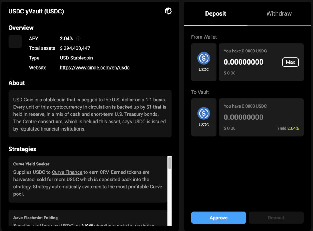 Na Yearn finance możemy zdeponować swoje LUSD na 3,46% APY, a USDC na 2,04% APY. Protokół używa zestawu strategii, by uzyskać największy zwrot przy zachowaniu odpowiedniego poziomu bezpieczeństwa naszych środków. Szczegóły strategii jakie wykorzystuje Yearn można znaleźć opisane na stronie tokena. Na zdjęciu poniżej znajdziemy szczegóły działania dla USDC: