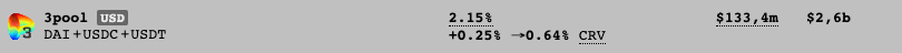 Np. w Curve 3Pool, który składa się z trzech tokenów: DAI, USDC oraz USDT, w tej chwili APY wynosi 2,15%, jednak czasami wzrasta wielokrotnie wyżej osiągając choćby poziomy 10%. Dzieje się tak ponieważ zapłatę otrzymujemy w tokenie CRV.