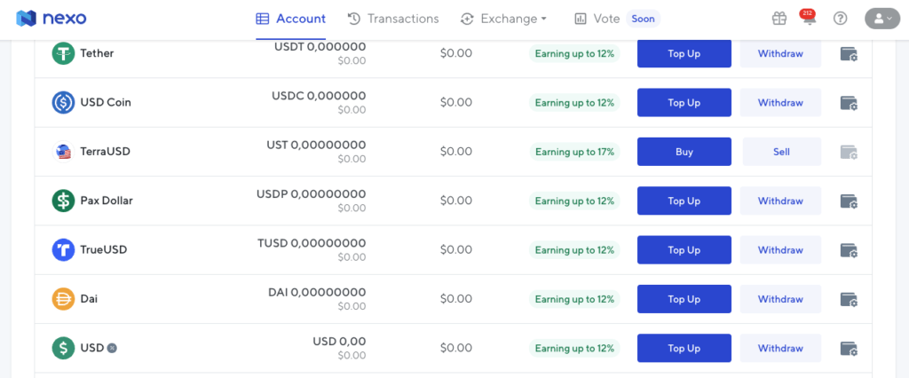 - Nexo oferuje nam 10% APR na najpopularniejszych stablecoinach takich jak USDC, USDT, DAI, USDP, a 12% APR, gdy wybierzemy opcje zarabiania w natywnym tokenie aplikacji NEXO. Za stablecoina UST możemy otrzymać odpowiednio 15% bądź 17%.