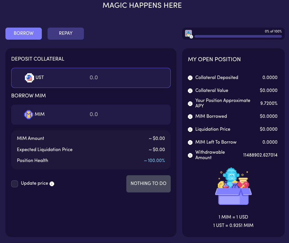 (źródło: link) Gdy deponujemy UST otrzymujemy 9,7% APY, ale równocześnie jesteśmy w stanie pożyczyć MIM w maksymalnej wysokości 90% naszego depozytu. Wobec tego, jeżeli zdeponujemy tam 10 tysięcy dolarów będziemy dostawali 9,7% APY a ponadto otrzymamy od protokołu 9 tysięcy MIM do naszego dowolnego użytku.