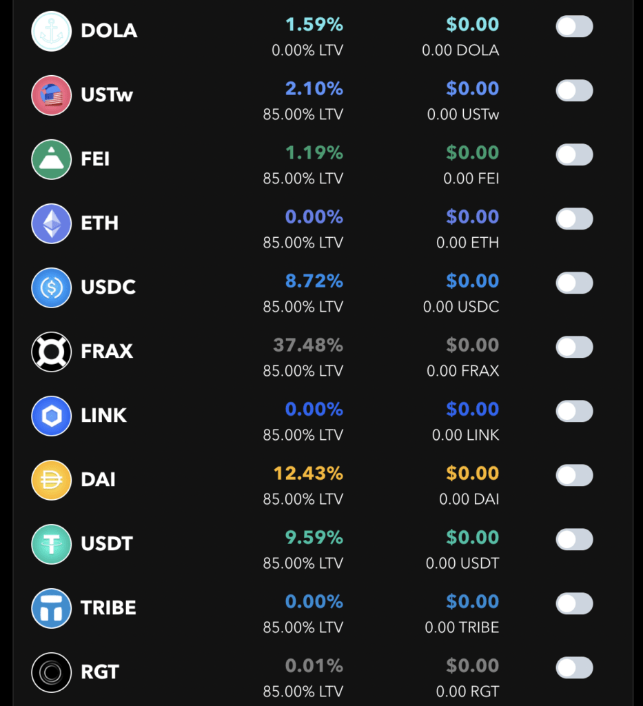 - Na czas pisania tego artykułu Rari Capital oferuje aż 12,43% APY na DAI oraz 8,72% na USDC, najwięcej jednak można zarobić na FRAX, za którego można otrzymać ponad 37% APY.