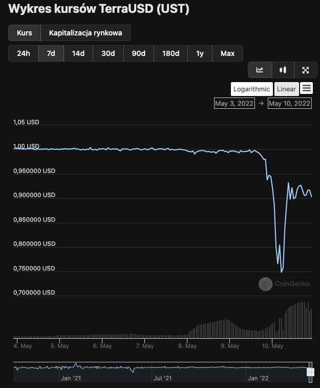 Wbrew temu co mogłoby się wydawać takie sytuacje wcale nie są takie rzadkie, szczególnie w trudnych warunkach rynkowych, które w tej chwili występują, a na które nasz portfel stablecoinowy powinien być odporny. Dla przykładu: na początku kwietnia tego roku Neutrino Dollar (USDN) stracił pegga i spadł do poziomu 0.82 $, podobnie TerraUSD na czas pisania tego artykułu traci pegga i spadła do poziomu 0.74 $.