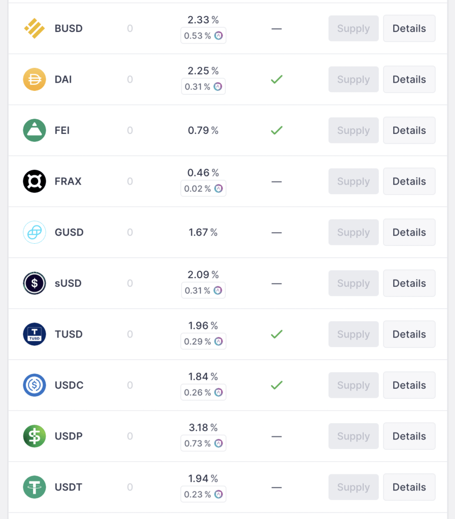- Aave w tej chwili oferuje 2,25% na DAI oraz 1,94% na USDT, na uwagę może zasługiwać USDP za którego można dostać 3,18%