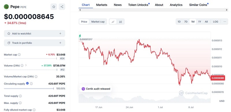 Fot. materiały partneraNic dziwnego, iż od swojego debiutu token $PEPE mocno zyskał na wartości. Jak wskazuje wykres na CoinMarketCap, od pierwszej sesji moneta urosła o ponad 15000 proc. o ile choćby ktoś zainwestował w $PEPE przed rokiem, dziś cieszyłby się rentownością inwestycji na poziomie ponad 460 proc. W ostatnim czasie token jest w niewielkim odwrocie, ponieważ w miesiąc stracił blisko 35 proc. Korekta po wzrostach jest normalna, ale należy zauważyć, iż w rodzinie Pepe w tym czasie lepiej radził sobie na przykład chiński odpowiednik oryginału – token PeiPei.