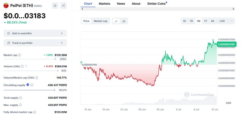 Również jest to moneta stworzona w sieci Ethereum. Całkowita podaż została określona na blisko 290 mld monet $PEIPEI. Token zadebiutował już na giełdach i radzi sobie całkiem dobrze. W przeciwieństwie do oryginału, w ostatnim miesiącu token ten zyskał na wartości blisko 70 proc. i ponad 680 proc. od niedawnego debiutu.