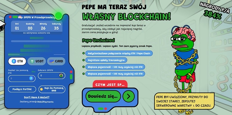 Fot. materiały partneraPepe Unchained rozwiązuje ten problem. Token powstał na blockchainie warstwy 2 Ethereum. W związku z tym jest to pierwszy token w rodzinie Pepe, który powstał na własnym łańcuchu. W zasadzie jest to nowy ekosystem będący środowiskiem dla wschodzących memecoinów.