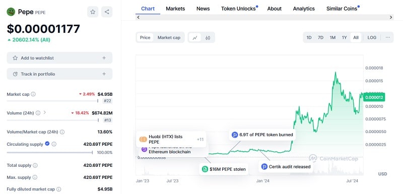 Rodzina monet Pepe jest bardzo szeroka. Oczywiście przez cały czas królem w tej kategorii memecoinów jest $PEPE. Moneta została stworzona ponad rok temu, w kwietniu 2023 roku. Aktualnie Pepe to kapitalizacja rzędu blisko 5 mld USD.