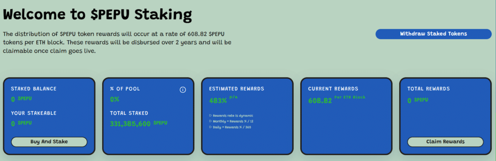 Pepe Unchained wyróżnia się nie tylko niezależną warstwą drugą, ale także hojnymi nagrodami za stakowanie, nieporównywalnymi z innymi tokenami Pepe. Oferuje imponujące 483% APY, co daje możliwość inwestorom podwojenia swoich tokenów w mniej niż miesiąc. Imponująca liczba 331 milionów zablokowanych tokenów $PEPU oznacza niezachwiane zaufanie do Pepe Unchained w perspektywie długoterminowej.