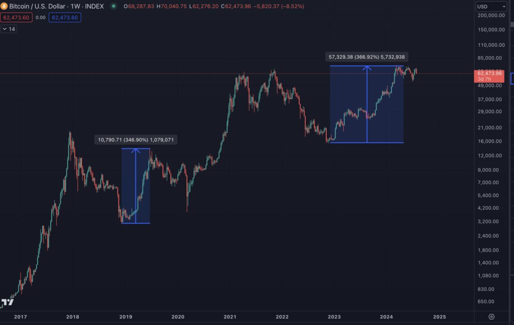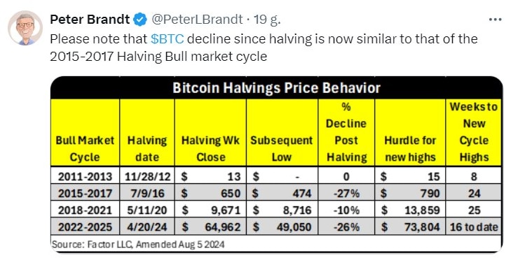 W poście opublikowanym w dniu wczorajszym na platformie X analityk stwierdził, iż „spadek BTC od czasu halvingu jest teraz podobny do tego z cyklu hossy 2015-2017”.