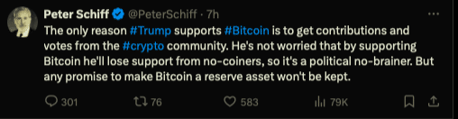 „Jedynym powodem, dla których Trump popiera kryptowaluty, jest chęć zbierania większej liczby datków i głosów od społeczności. To polityczna oczywistość. Żadna obietnica robiąca z Bitcoin aktyw strategiczny rzecz jasna nie zostanie dotrzymana” – argumentuje krytyk Bitcoina.