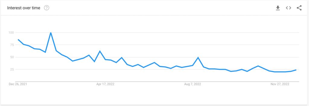 Według Google Trends malejący popyt spowodował również, iż zapytania internetowe dotyczące słowa kluczowego „kup kryptowalutę” spadły do najniższego poziomu od lutego 2020 roku.