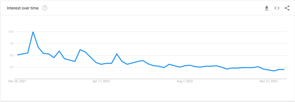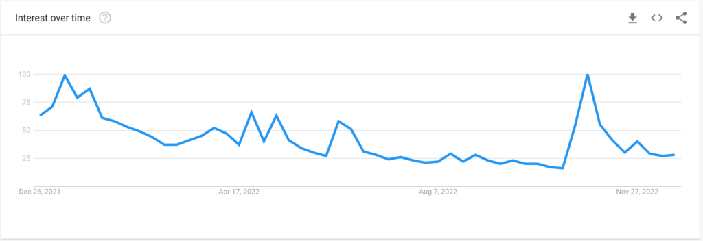 Ponadto, liczba wyszukiwań Shiba Inu w Internecie wzrosła również z powodu Crypto.com, giełdy kryptograficznej z największą pozycją SHIB w listopadzie 2022 r. Rynek obawiał się, iż Crypto.com stanie się niewypłacalny, co skłoni ją do sprzedaży swoich udziałów SHIB-y .