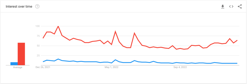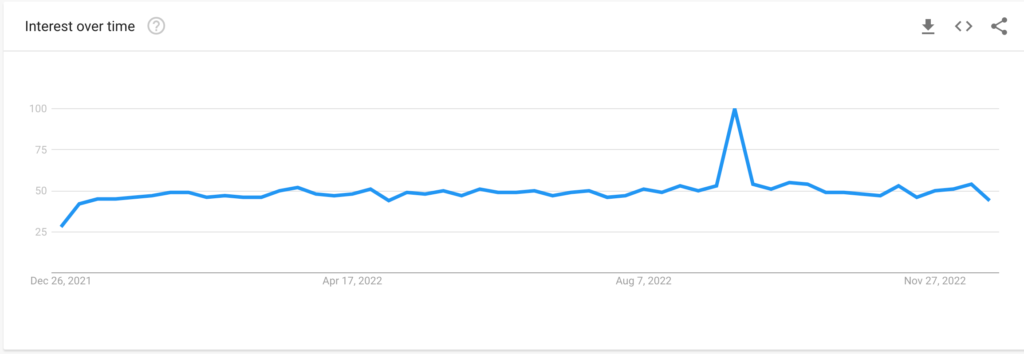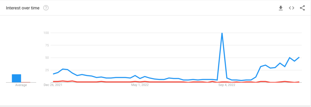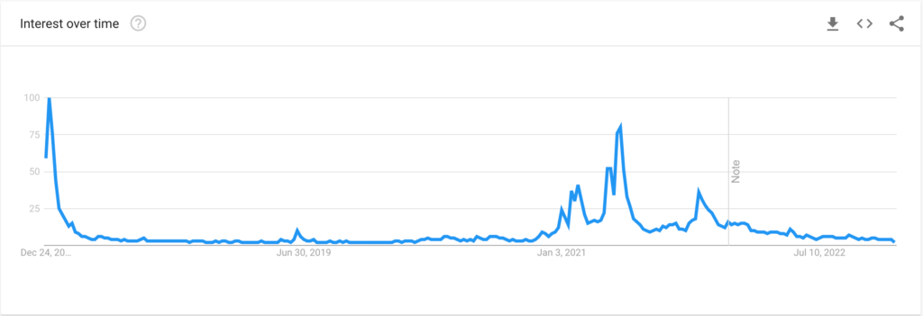 Zdarzenia te pomogły Dogecoin odnotować tymczasowe wzrosty wyszukiwań w Internecie, jak pokazano na poniższym wykresie Google Trends. Na przykład ostateczny wykup Twittera przez Muska pod koniec października zbiegł się w czasie z trendami internetowymi Dogecoina, które osiągnęły doskonały wynik 100.