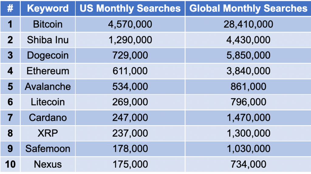 W przypadku kryptowaluty Shiba Inu SHIB miesięczne wyszukiwania w Internecie na całym świecie wyniosły 4,43 miliona. Niemniej jednak mem-coin pokonał swojego największego rywala Dogecoin w USA, z 1,29 milionami miesięcznych wyszukiwań w porównaniu z 729 000 DOGE.