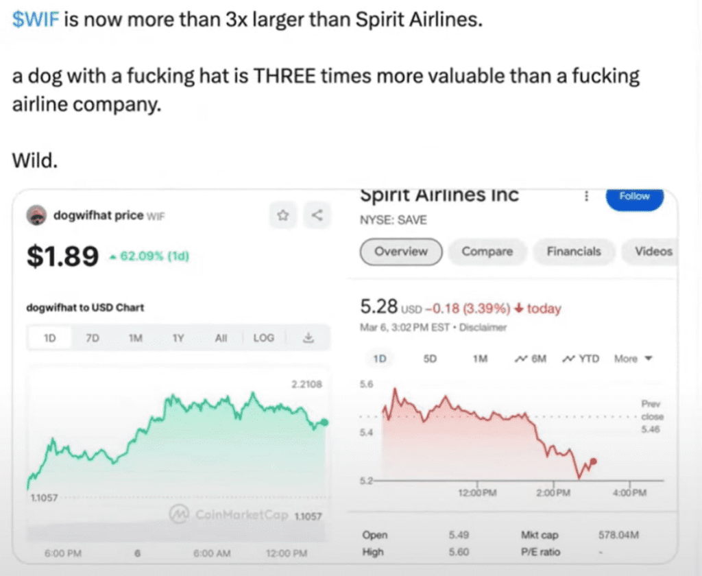 fot. CMCPewnego absurdu całej sytuacji dodaje komentarz jednego z krypto influencerów, który porównał kapitalizację całkowitą Dogwifhat (ang. „piesek z kapeluszem”) do wyceny linii lotniczych Spirit Airlines Incorporated. Pozbawiona fundamentów kryptowaluta jest aktualnie prawie czterokrotnie „cenniejsza” zdaniem inwestorów aniżeli spółka posiadający faktyczny kapitał i regularny cashflow.