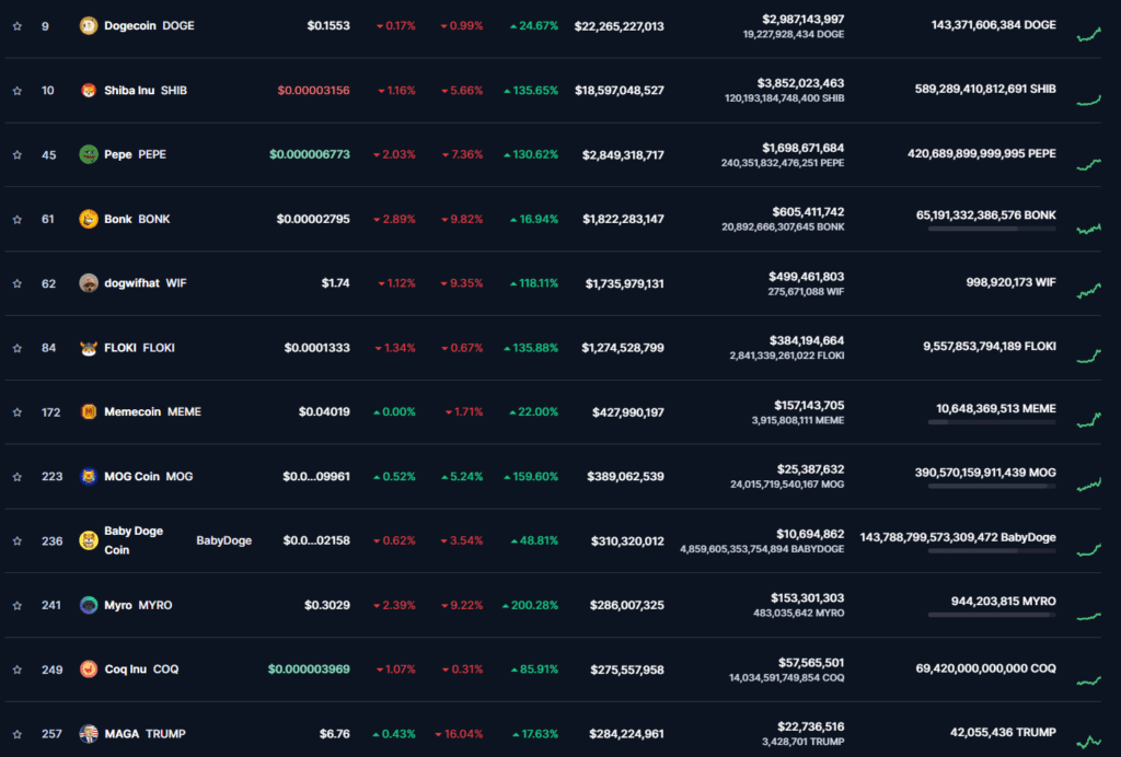 fot. CMCMimo częściowej korekty wiele monet memowych przez cały czas rośnie, a Shiba Inu (SHIB) i Dogecoin (DOGE), największe mem-coiny odnotowały wzrosty między 100 a 200% w ciągu ostatnich 7 dni. Nowsze tokeny, takie jak PEPE, WIF, FLOKI i TURBO, wszystkie wzrosły o ponad 200% w ciągu tygodnia. Trzy z nich osiągnęły nowe ATH: PEPE, BONK i WIF.