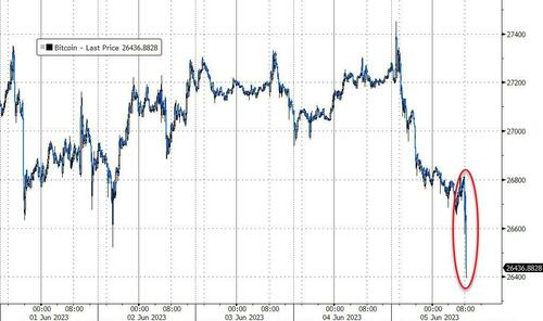 Po tych informacjach cena Bitcoina rozpoczęła ruch spadkowy i osuwa się w okolice 26,500 USD. Źródło: ZeroHedge