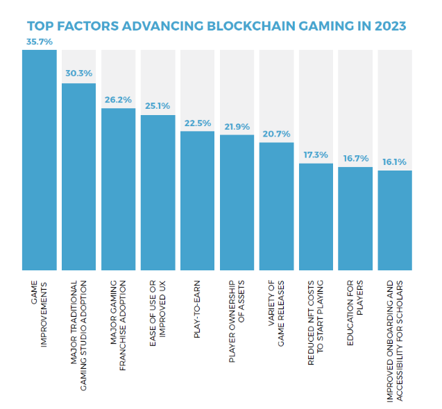 2 lata temu w 2021 roku, aż 67,9% respondentów opowiedziało się za trendem play to earn. Ten trend miał być motorem wzrostów gier na blockchain. W raporcie dane mocno odstają od tamtego badania, bo tylko 22.5% widzi w trendzie P2E przyszłość. Ulepszenie rozrywki to najważniejszy czynnik, według ankietowanych, który ulepszy rozwój branży gier na łańcuchu bloków – z wynikiem 35,7 %.