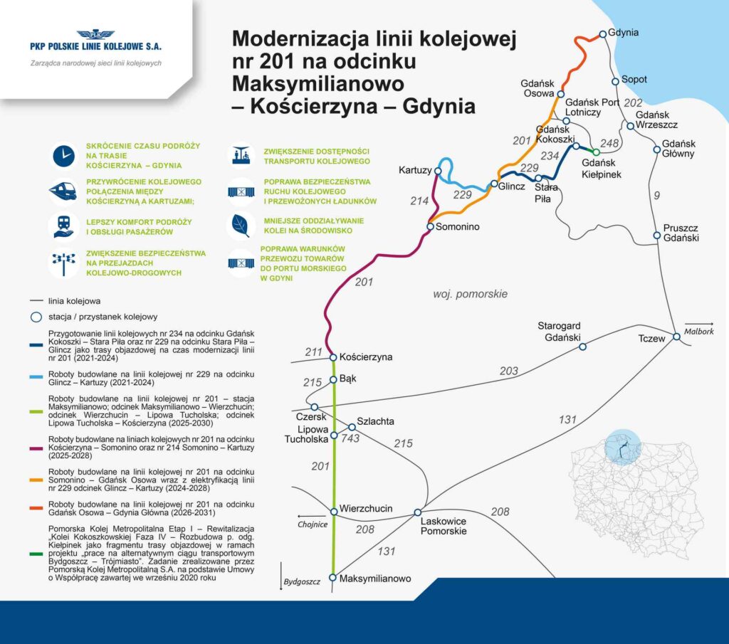 Roboty realizowane są również na odcinkach Kościerzyna – Somonino (wraz z linią kolejową nr 214 Somonino-Kartuzy) oraz Somonino – Gdańsk Osowa (wraz z elektryfikacją linii kolejowej nr 229 odc. Glincz – Kartuzy). We wrześniu br. PLK podpisały umowę na modernizację stacji Maksymilianowo za ponad 1 mld zł brutto.