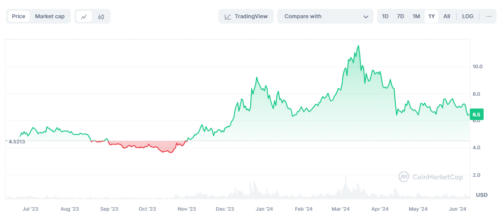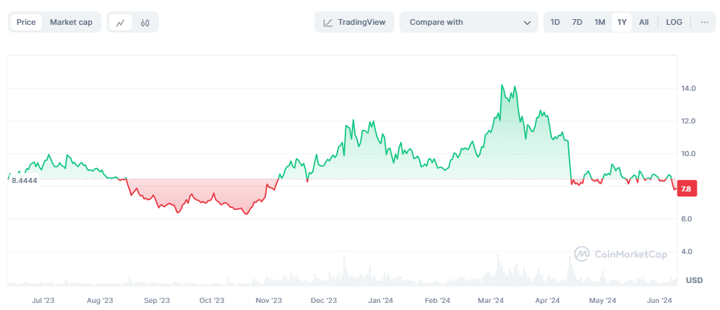 Aktualnie cena monety obniżyła się do 7.85 USD. Jednak analitycy pozostają optymistyczni względem kryptowaluty, przewidując potencjalny wzrost w nadchodzących dniach po przebiciu oporu.