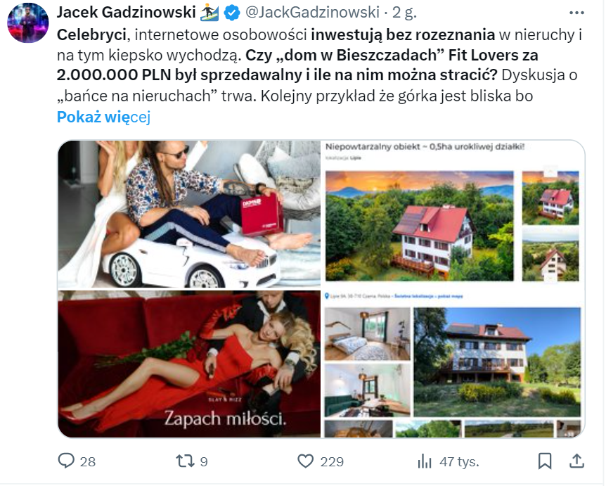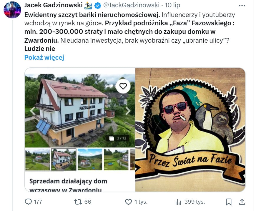 Popularny na X Jacek Gadzinowski, przekazał w ostatnim czasie dwie sprawy: inwestycje w 'domek w Bieszczadach’ przez popularną parę celebrytów-fitness 'Fit Lovers’ oraz ośrodek turystyczny w Zwardoniu, za którym stoi Dawid 'Faza’ Fazowski, znany z kanału podróżniczego 'przez świat na Fazie’.