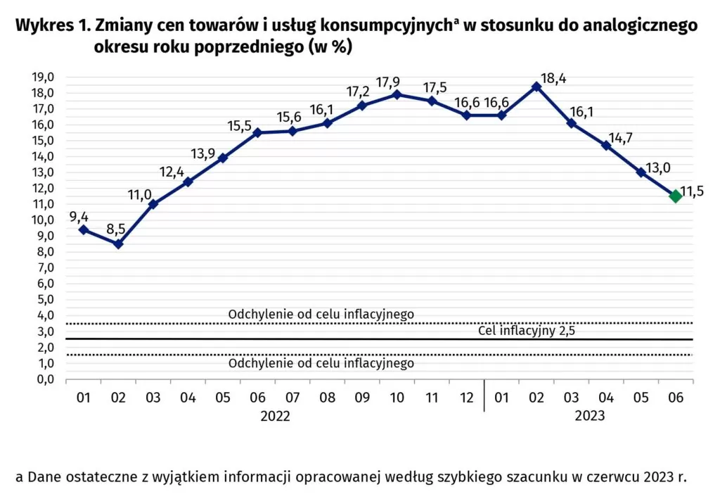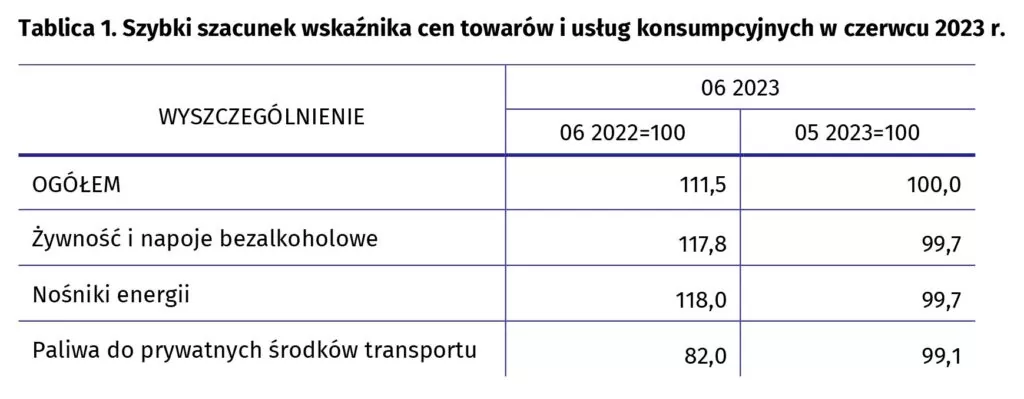 Ceny towarów i usług konsumpcyjnych według szybkiego szacunku w czerwcu 2023 r. w porównaniu z analogicznym miesiącem ubiegłego roku wzrosły w naszym kraju o 11,5 proc. (wskaźnik cen 111,5), a w stosunku do poprzedniego miesiąca utrzymały się na tym samym poziomie (wskaźnik cen 100,0). Warto w tym miejscu zaznaczyć, iż w omawianym okresie w żadnym innym unijnym kraju ceny tak bardzo nie wzrosły.