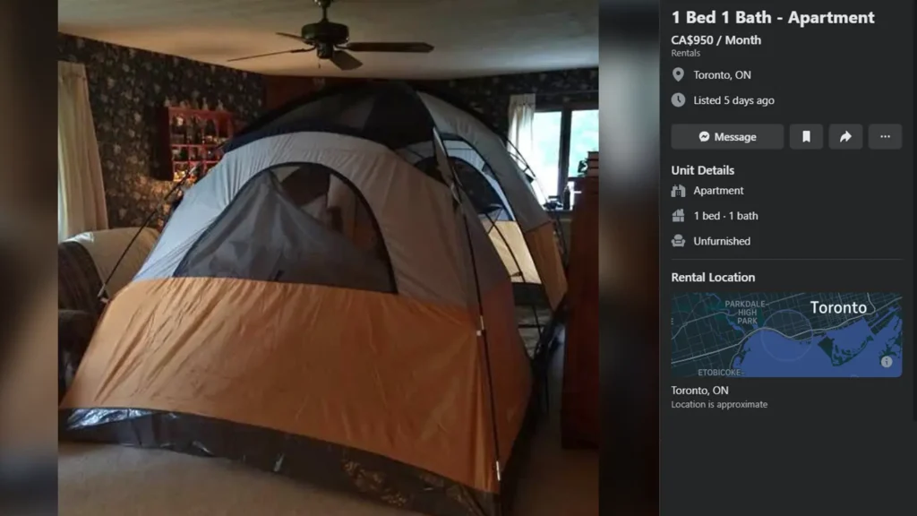 W największym kanadyjskim mieście i stolicy prowincji Ontario, Toronto, pewien właściciel mieszkania wpadł na świetny pomysł: zaoferował wynajem namiotu rozstawionego w salonie za 950 dolarów miesięcznie. Ogłoszenie trafiło na portal aukcyjny Facebook Marketplace i błyskawicznie zostało podłapane przez użytkowników platformy społecznościowej X (Twittera). Temat patologii na rynku nieruchomości mieszkaniowych podjęła też krajowa prasa.