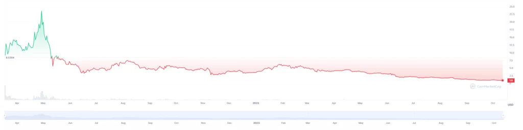 Na moment powstawania tego tekstu cena Polygon ($MATIC) wynosiła ok. 0,50 dolarów za sztukę i przez cały czas znajdowała się w średnioterminowym kanale spadkowym. Tymczasem ApeCoin ($APE), poza krótkim epizodem kiedy zanotowało swoje maksima niedługo po wejściu na giełdy, systematycznie „krwawi”.