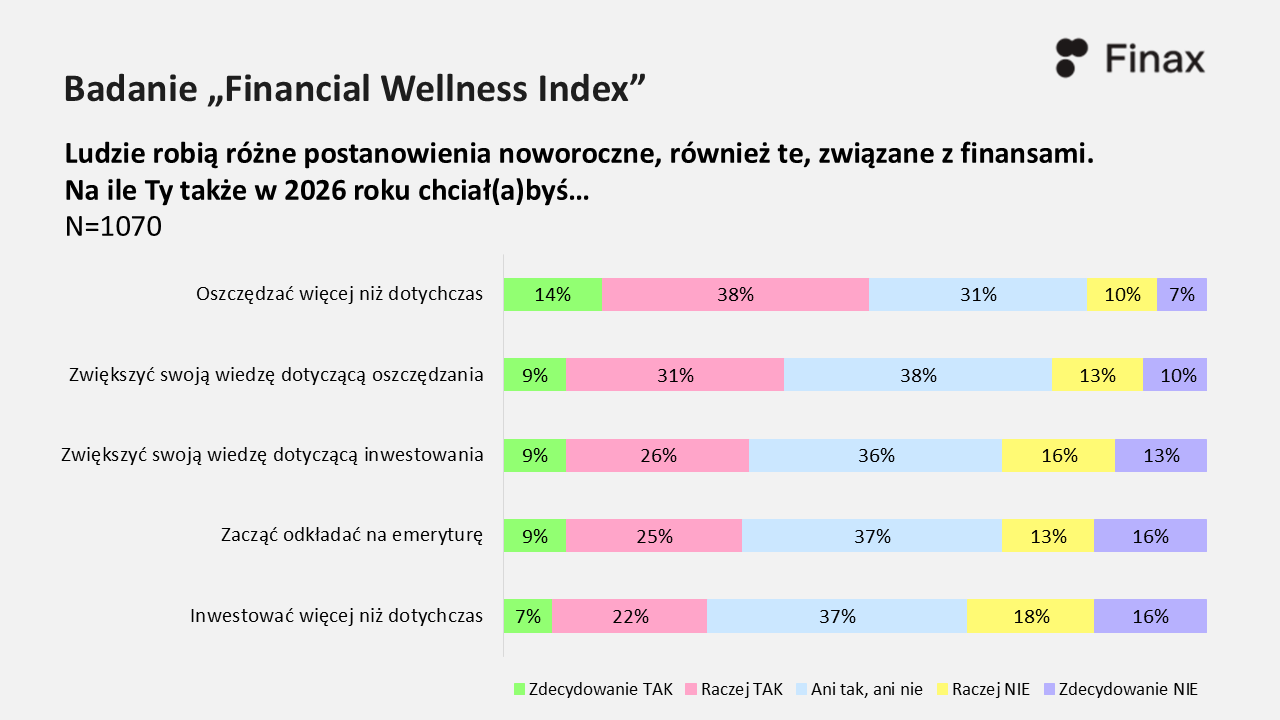 Nowy rok tradycyjnie przynosi nowe postanowienia, także te finansowe. Jak wynika z badania Finax „Financial Wellness Index”, 52 proc. Polaków deklaruje, iż w 2026 r. chce oszczędzać więcej niż dotychczas, a 40 proc. badanych planuje poszerzyć swoją wiedzę na ten temat. Zdecydowanie rzadziej w odpowiedziach pojawiły się aspiracje związane z inwestowaniem i budowaniem kapitału w długim terminie. Inwestować więcej planuje w tym roku jedynie 30 proc. badanych, a zaledwie 35 proc. osób chce rozwijać swoją wiedzę w tym zakresie. 34 proc. respondentów deklaruje chęć rozpoczęcia odkładania na emeryturę.