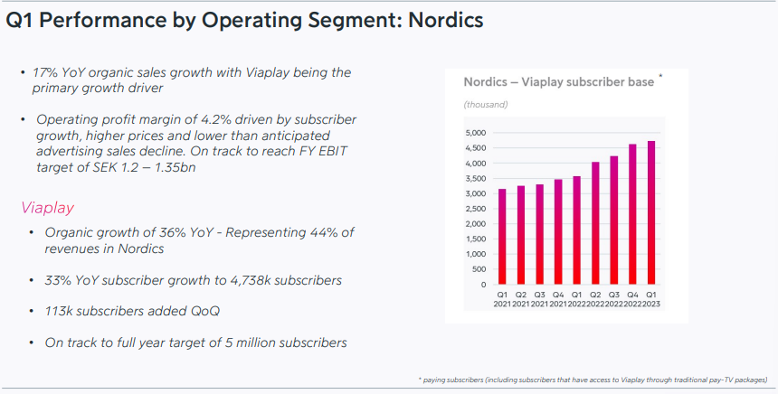 Źródło: ViaplayW krajach nordyckich spółka ma bardzo silną pozycję. Zarabia z opłat abonamentowych, reklam telewizyjnych. Liczba subskrybentów wyniosła 4,7 mln i jest blisko realizacji prognozy na 2023 rok (5 mln subskrybentów). Jednak z powodów pozycji rynkowych, dalszy wzrost będzie już bardzo trudny.