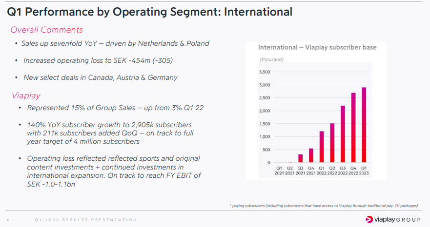 Warto zauważyć, iż na razie spółka posiada mniej niż 3 mln subskrybentów na rynkach innych niż nordyckie. Głównym motorem wzrostu rynku są Polska i Holandia. Rynek międzynarodowy generuje straty. Ma to związek z rozbudową oferty sportowej i oryginalnego contentu (seriale, filmy dokumenty).