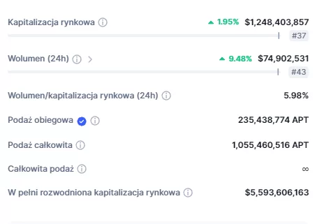 Jesiennie odblokowanie tokenów APT, jak donosi platforma tematyczna TokenUnlocks, ma uwolnić znaczną część podaży Aptos do tej znajdującej się aktualnie w obiegu, stanowiącą ponad 8,5% całkowitej podaży wynoszącej w chwili obecnej 235,02 mln tokenów. Posunięcie to stanowi część długoterminowej strategii protokołu mającej na celu zapewnienie płynności i wspieranie różnych inicjatyw ekosystemu.