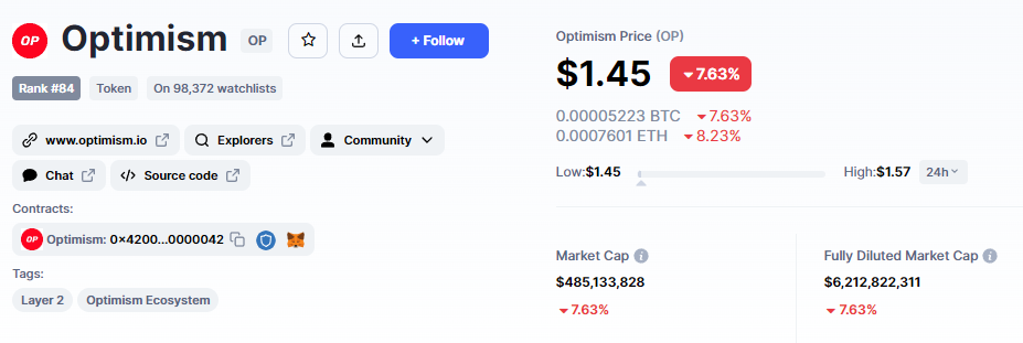Źródło: OptimismNa moment powstawania tego artykułu cena tokenów $OP spada, prawdopodobnie motywowana lękiem przed nadchodzącymi rozwodnieniami wartości.