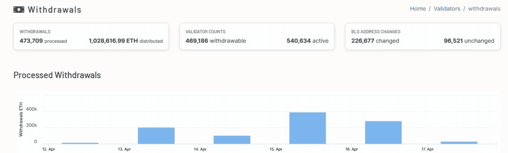 Według danych z beaconcha.in, 1,03 miliona wypłat ETH pochodziło z 473 700 wniosków o wypłatę. Przy czym sobota, 15 kwietnia, była największym dniem wypłat na poziomie 392 800 ETH.