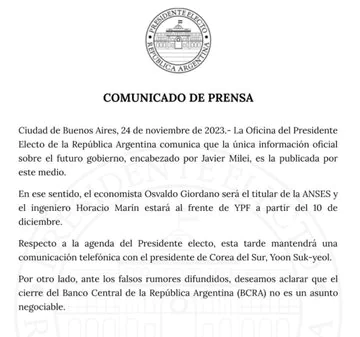 Jednym z nich było domaganie się rozwiązania banku centralnego Argentyny – który Milei pragnął obrazowo wysadzić w powietrze. Tymczasem prezydent-elekt Argentyny twierdzi, iż swój kampanijny postulat traktuje absolutnie poważnie – przynajmniej jeżeli chodzi o aspekt instytucjonalny. Zgodnie z oświadczeniem wydanym przez jego biuro, likwidacja Banku Centralnego Republiki Argentyńskiej będzie jednym z jego pierwszych aktów i „nie podlega negocjacjom”.