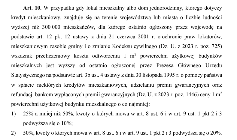 Zatem limity będą wyższe gdy lokal mieszkalny albo dom jednorodzinny, którego dotyczy kredyt, znajdzie się na terenie województwa lub miasta o liczbie ludności wyższej niż 300 000 mieszkańców, dla którego ostatnio ogłoszony przez wojewodę wskaźnik przeliczeniowy kosztu odtworzenia 1 m kw. powierzchni użytkowej budynków mieszkalnych jest wyższy od ostatnio ogłoszonej przez Prezesa Głównego Urzędu Statystycznego o co najmniej: