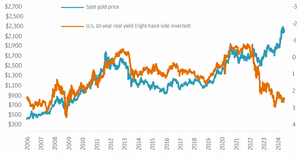 Tradycyjnie, słabszy dolar amerykański i niższe amerykańskie stopy procentowe zwiększają atrakcyjność kruszcu nie przynoszącego dochodu. Jednak na początku 2022 r. zaczęło pojawiać się znaczące oddzielenie od siebie tych dwóch czynników, a związek złota z realnymi rentownościami w USA jeszcze bardziej się pogorszył w 2024 roku.