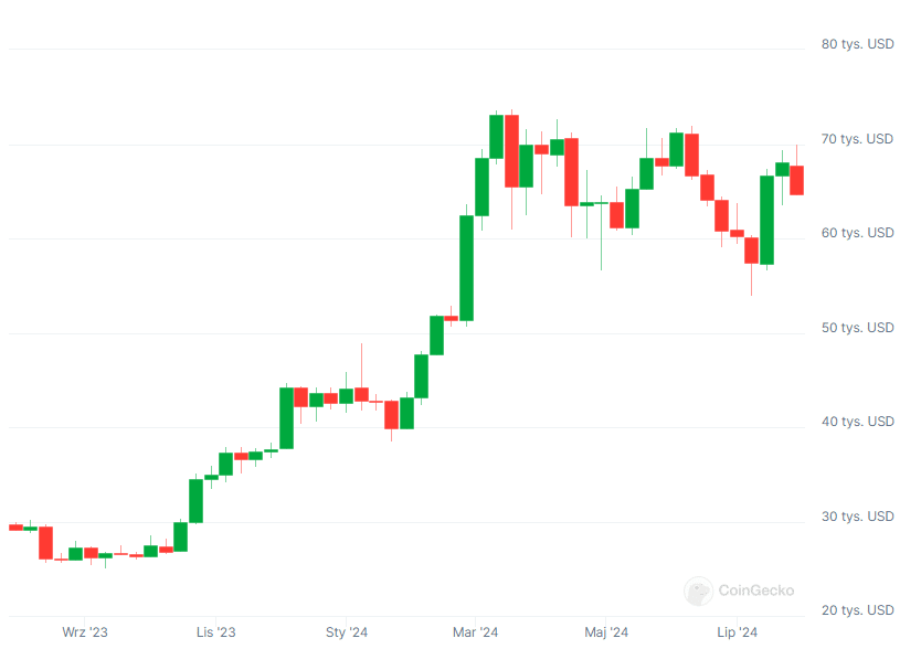 Wykres kursu kryptowaluty Bitcoin (BTC), para BTCUSD, źródło: CoingeckoW kontekście Ethereum Ryan Lee przewiduje możliwą zmienność cen w sierpniu 2024 roku, wynikającą z odpływów z funduszu Grayscale oraz nowo uruchomionego ETF-u na ETH. „Na wyniki Ethereum mogą początkowo wpływać odpływy z Grayscale, ale oczekuje się, iż odbiją one, gdy ETF na ETH zyska na popularności,” wyjaśnia Lee. Choć początkowo ETH może znaleźć się pod presją spadkową, Lee przewiduje, iż wraz z napływem środków do ETF, cena Ethereum może znacząco wzrosnąć.