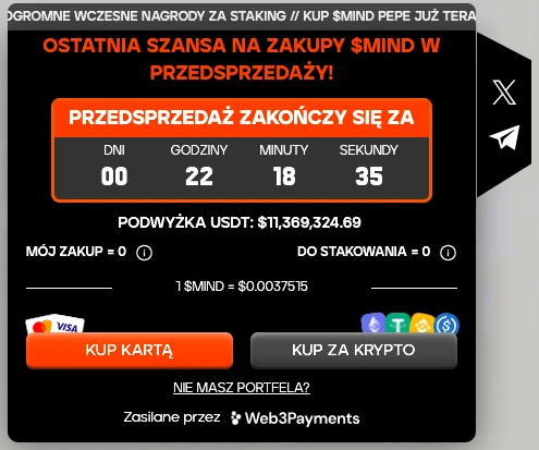 Pamiętaj, iż choćby najbardziej obiecujące inwestycje są na rynku krypto obarczone dużym ryzykiem. Przed kupnem jakichkolwiek tokenów, przeprowadź samodzielny research i skonsultuj się z doradcą. jeżeli jednak chcesz zainwestować w Mind of Pepe, to ostatnia szansa – wejdź na stronę i kup tokeny, aby stać się przyszłością rynku krypto AI.