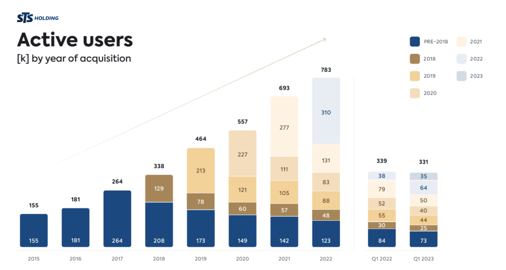 Spółka działa na rynku hazardowym (tj. bukmacherskim i gier). Jak widać na wykresie poniżej, jest to biznes, który potrzebuje nieustannej akwizycji klientów. W 2021 roku firma pozyskała 277 tys. klientów (kont). Na koniec 2022 roku z tej kohorty liczba aktywnych kont spadła do 131 tys. W 2020 roku spółka pozyskała 227 tys. klientów. Po dwóch latach liczba aktywnych kont z tej kohorty wyniosła 83 tys. Oznacza to spadek o 63,4% w dwa lata. Nie dziwi więc, iż tego typu firmy inwestują bardzo duże środki w reklamę. Celem jest akwizycja jak największej liczby klientów. Od 2018 roku w każdym roku spółka pozyskuje coraz więcej użytkowników. W 2018 roku było to 129 tys. klientów, z kolei w 2022 roku 310 tys.
