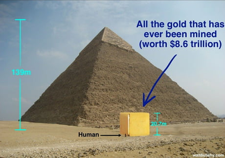 Zestawienie złota i egipskiej piramidy. Warte blisko 9 bln USD złoto można byłoby zamknać w sześcianie o długości boku 20,7 m. Źródło: 9GAG