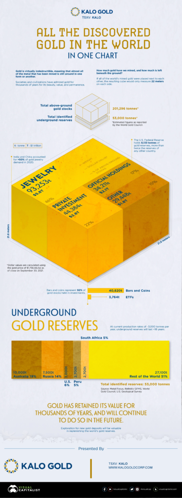 Do tej pory wydobyto około 200 000 ton złotego kruszcu, który można byłoby zamknać w sześcianie o długości boku niespełna 22 metrów, co pokazuje powyższa infografika. Zdecydowana większość dostępnego złota ulokowana została w biżuterii i prywatnych inwestycjach. Ponad 50 000 ton złota wciąż czeka na wydobycie. Źródło: KaloGold, Visual CapitalistPotęga kosmosu